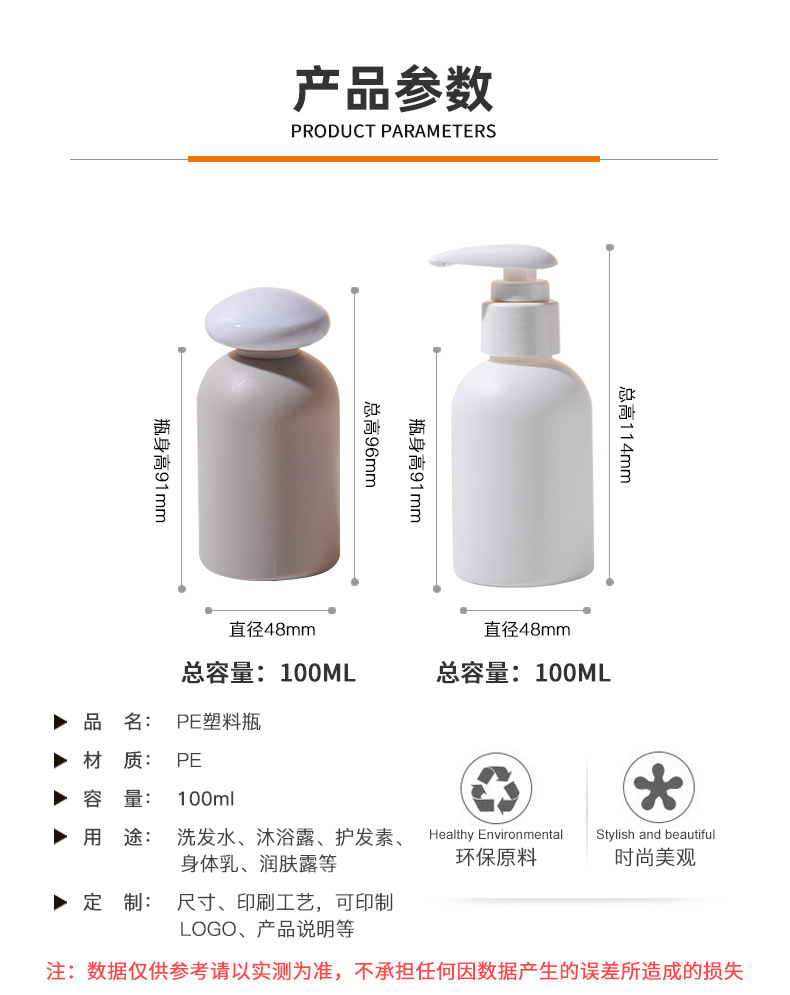 • PE圓肩洗護(hù)瓶包材旅行裝100ml乳液分裝瓶洗發(fā)水瓶沐浴露瓶子,適用洗發(fā)水、沐浴露、護(hù)發(fā)素、身體乳、洗衣液等。